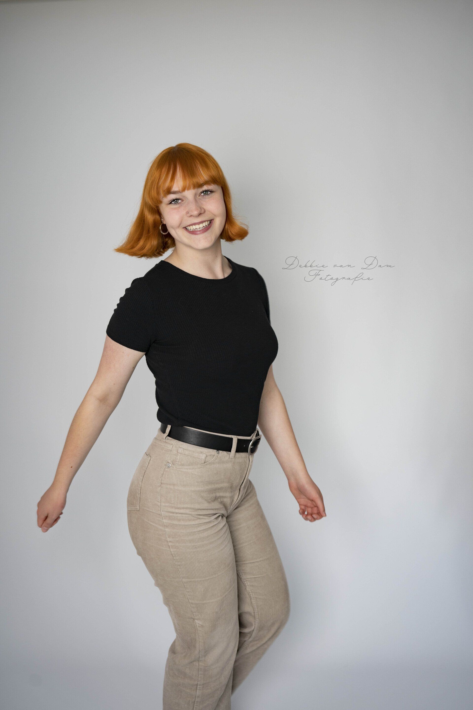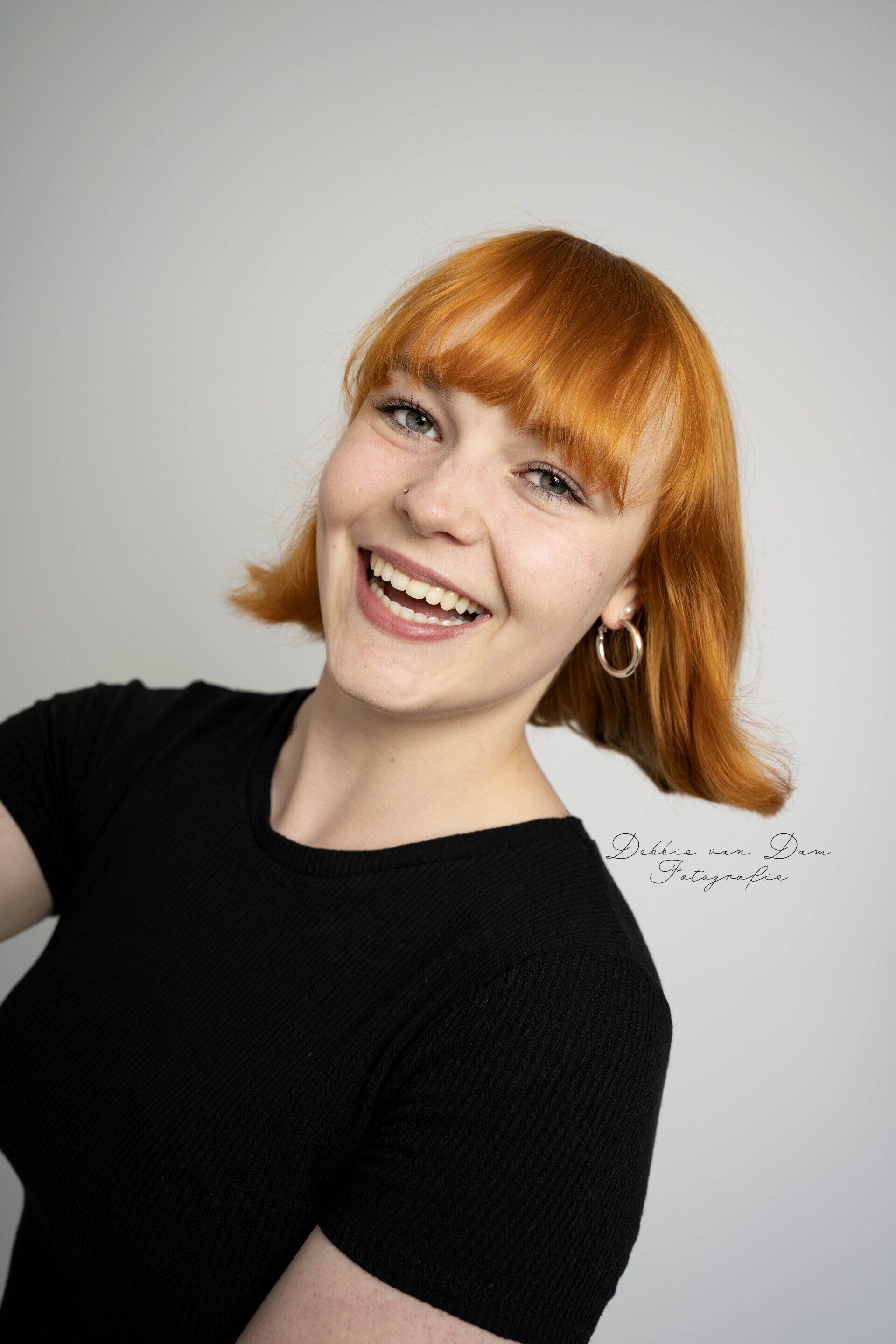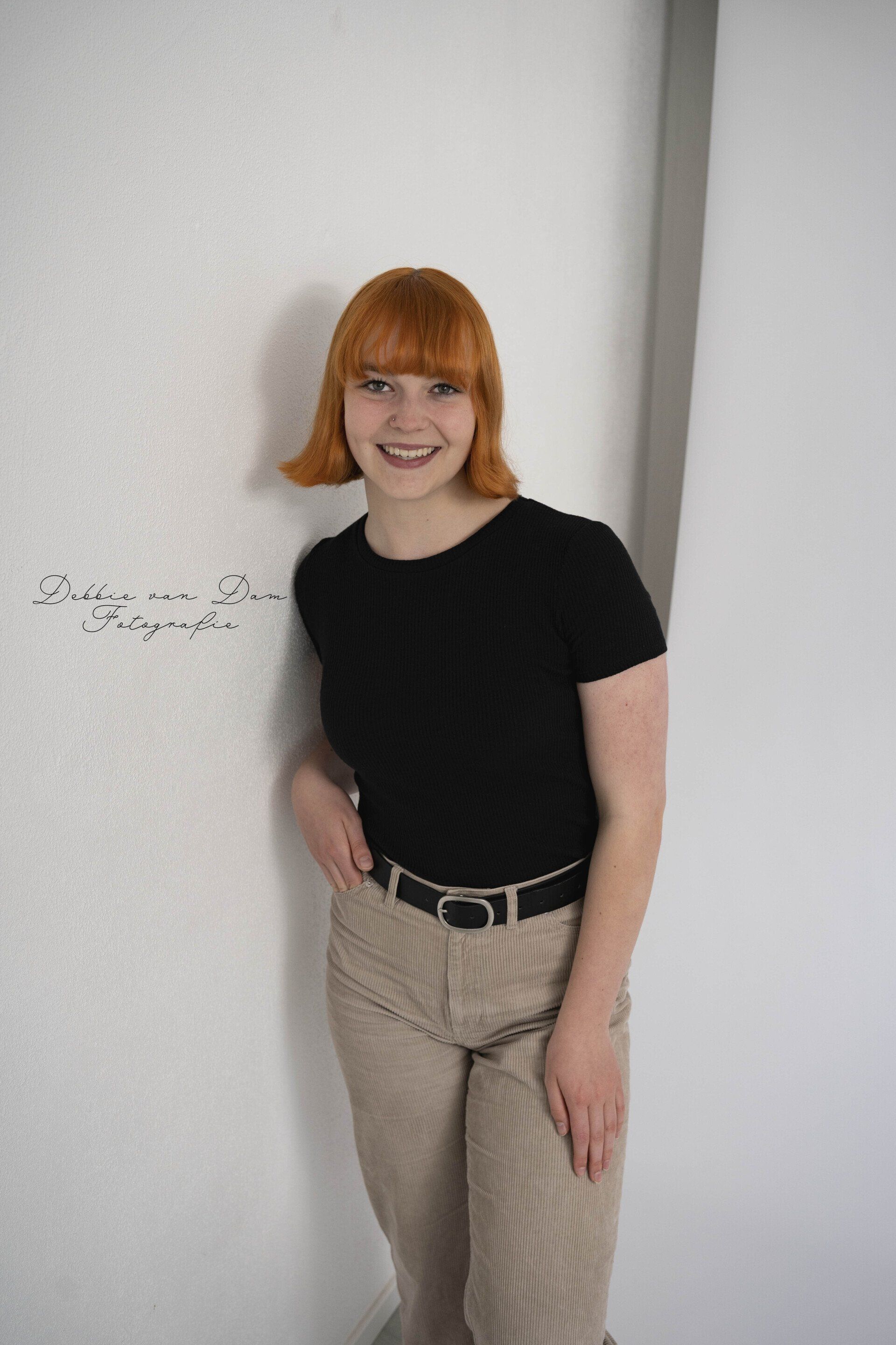 Dit is Noortje Sap. Wat een kleurrijke verschijning komt mijn studio binnen! Dat heeft niet eens alles te maken met haar geweldige haarkleur. Vooral met haar persoonlijkheid.